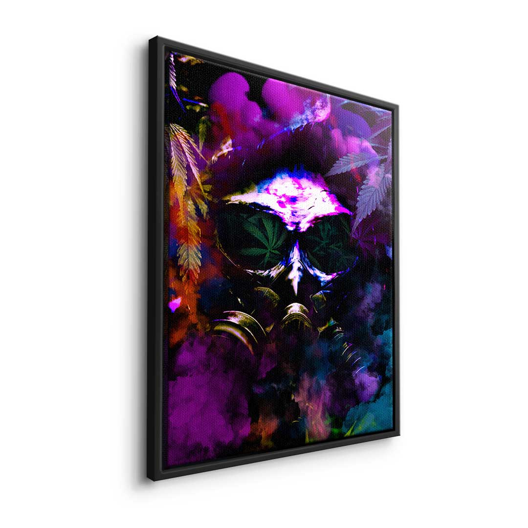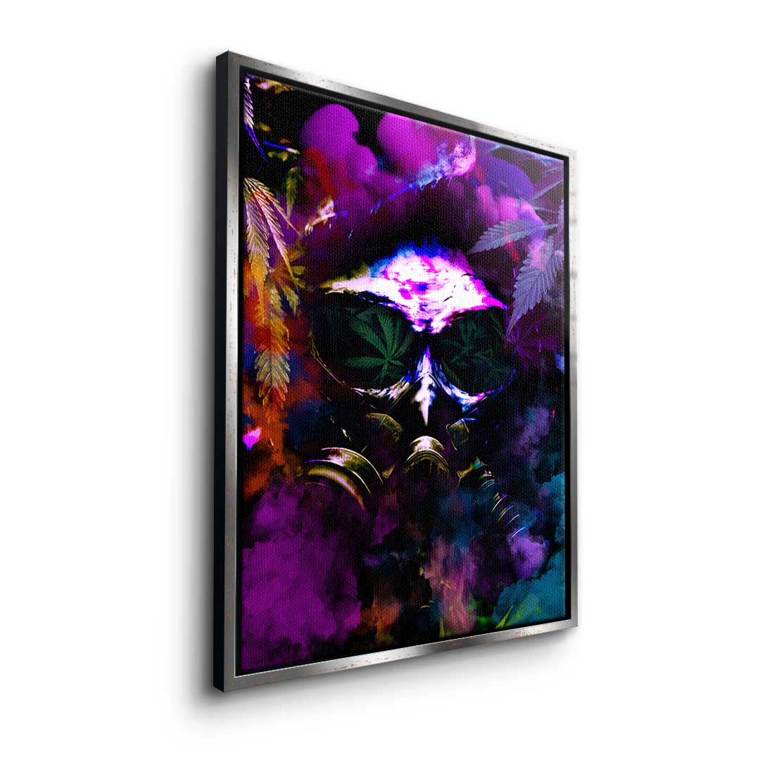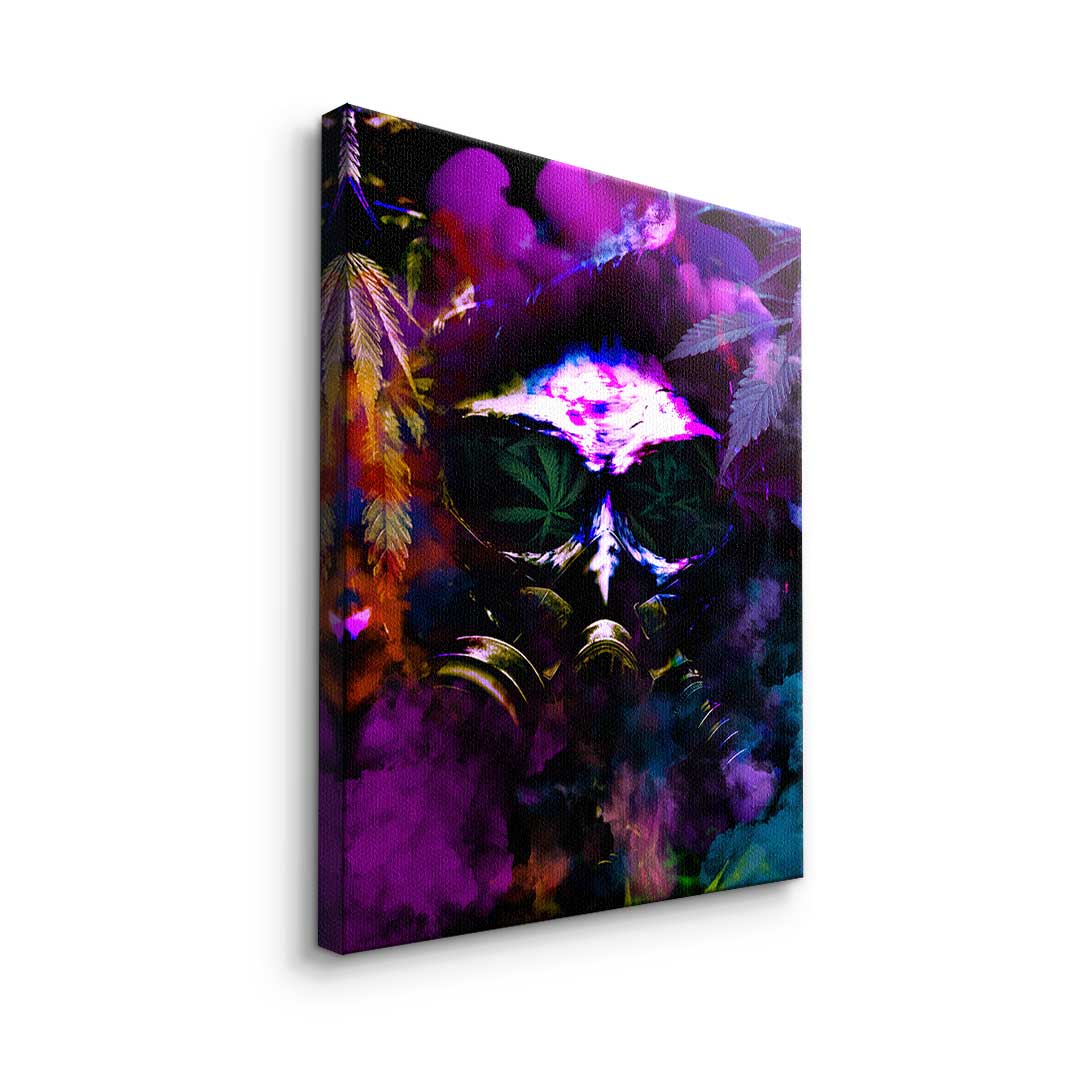 DOTCOMCANVAS® Premium Leinwandbild im Pop Art Stil mit Cannabis Motiv und Gasmaske in Lila, Grün und Orange.
