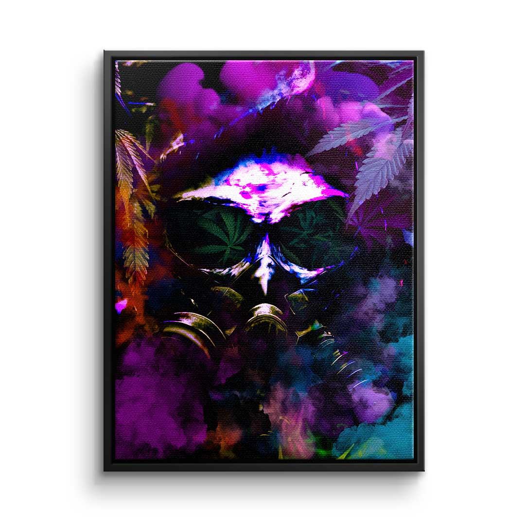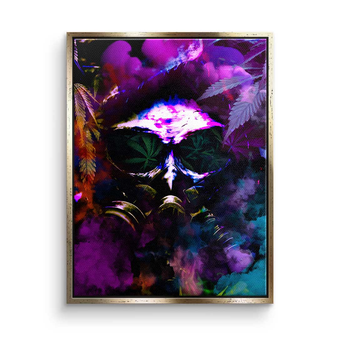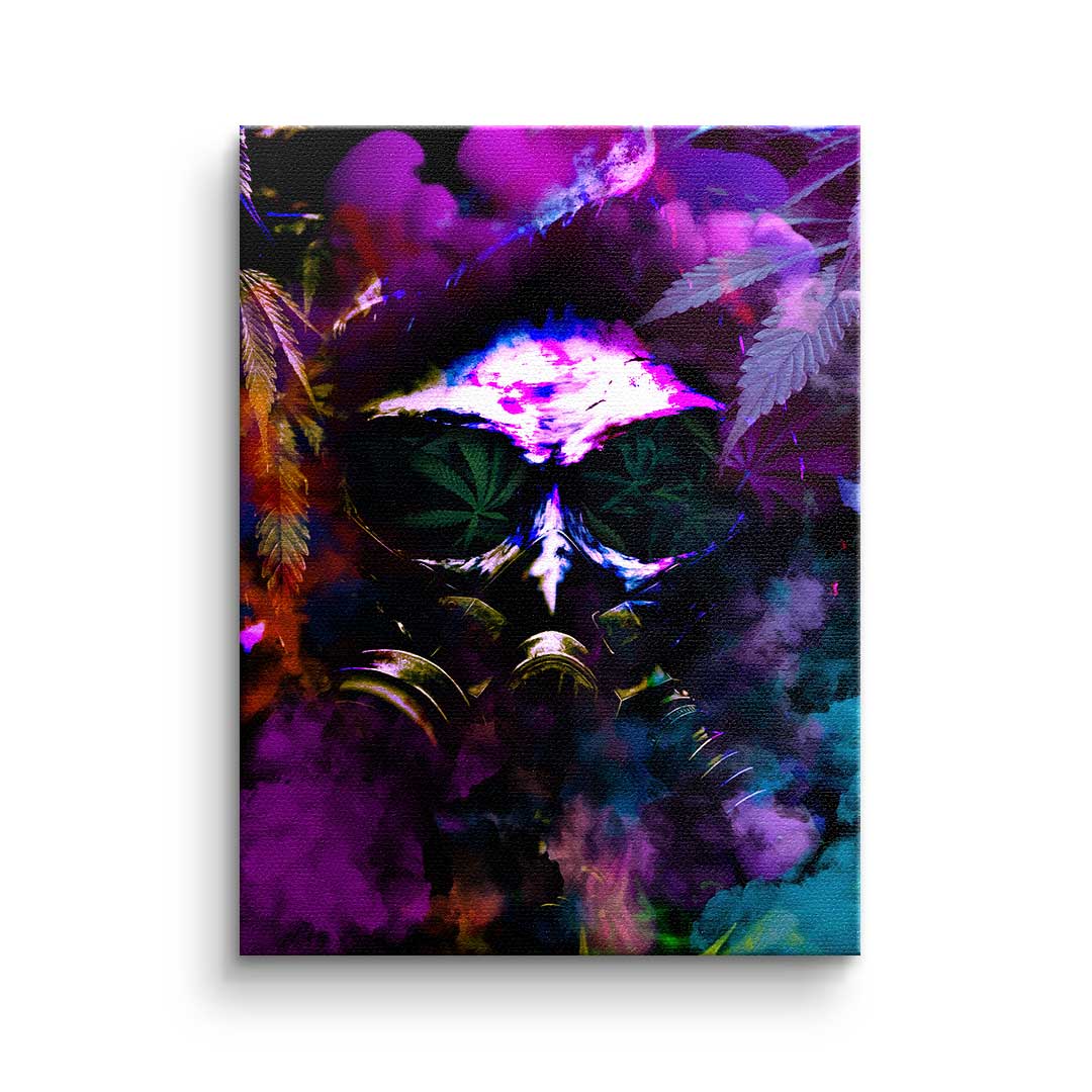 DOTCOMCANVAS® Premium Leinwandbild im Pop Art Stil mit Cannabis Motiv und Gasmaske in Lila, Grün und Orange.