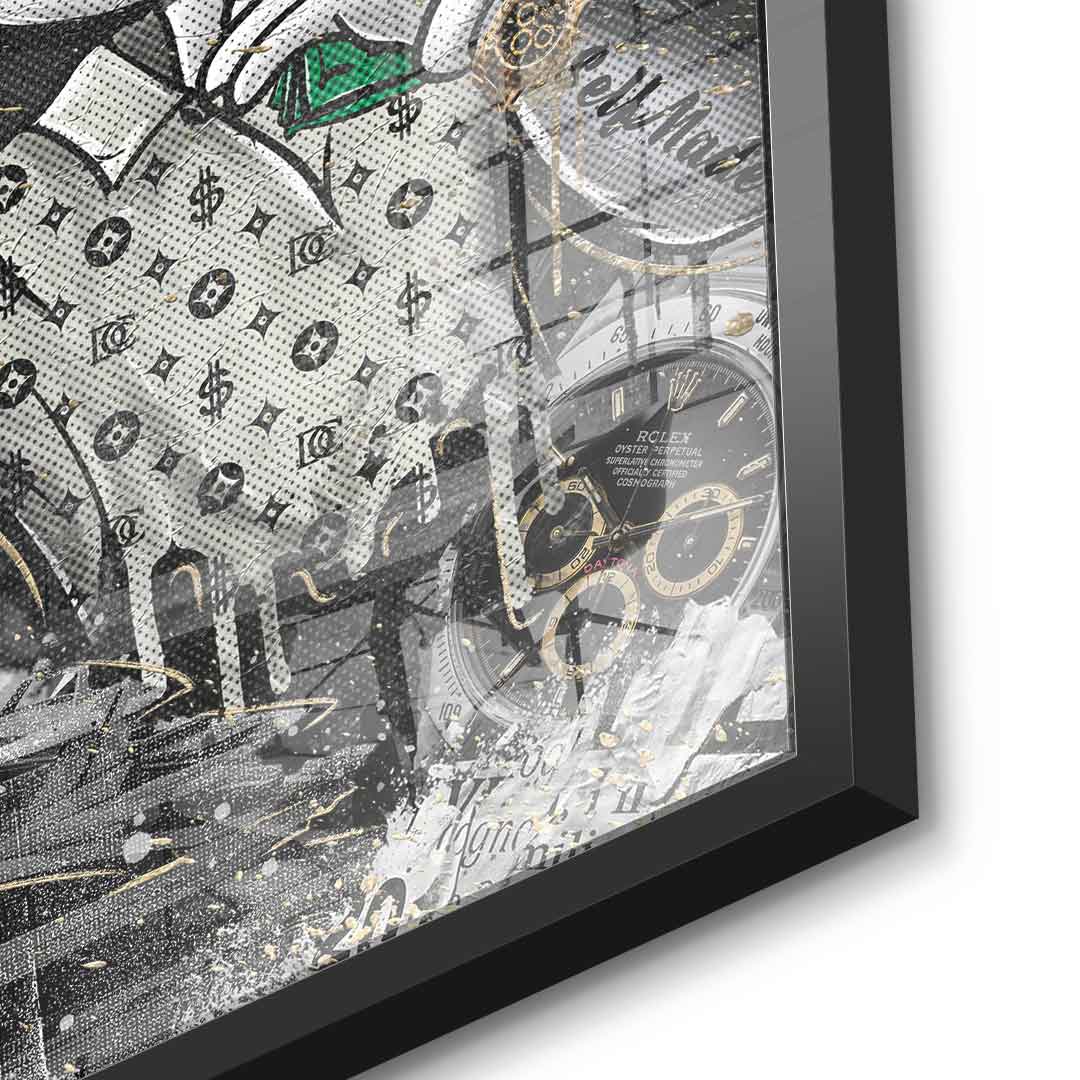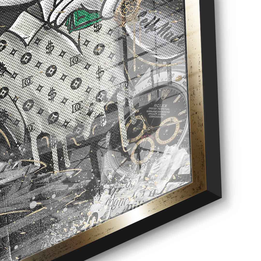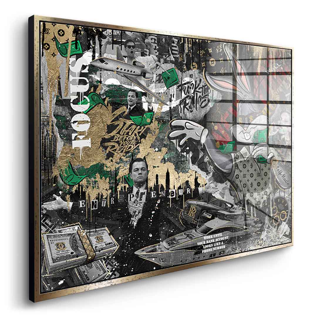 DOTCOMCANVAS® premium acrylic glass print in pop art style featuring the Business Bunny. The fourth edition in the Smart Bunny collection . As an homage to the famous Wolf of Wall Street scene, the Smart Bunny is used as the main character. The print primarily impresses with its combination of gold, black, green, and a few other color accents. The wall art is further enhanced by numerous quotes and sayings that reflect the lifestyle and mindset of successful people.