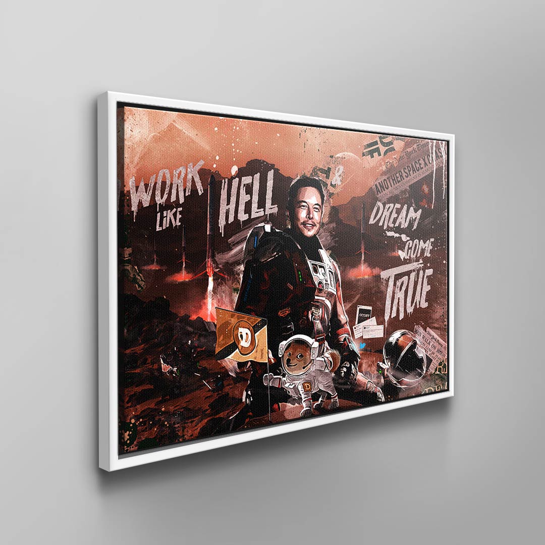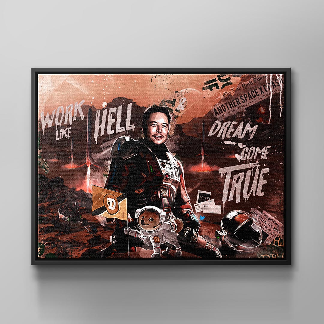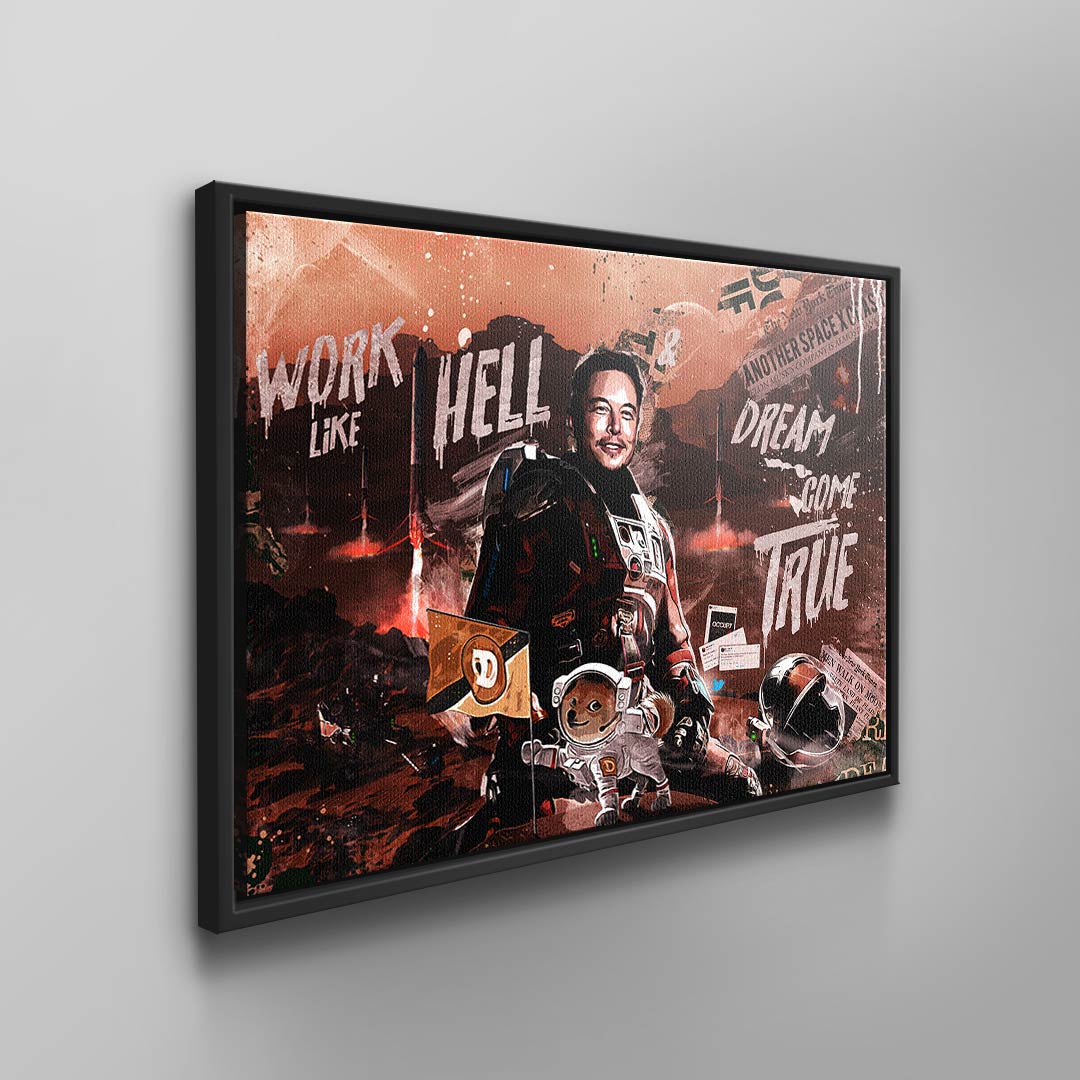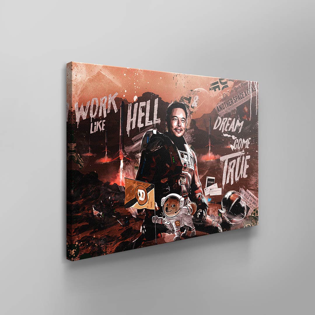 DOTCOMCANVAS® wall mural with provocative and creative Elon Musk motif "Work like Hell, Dream come True."