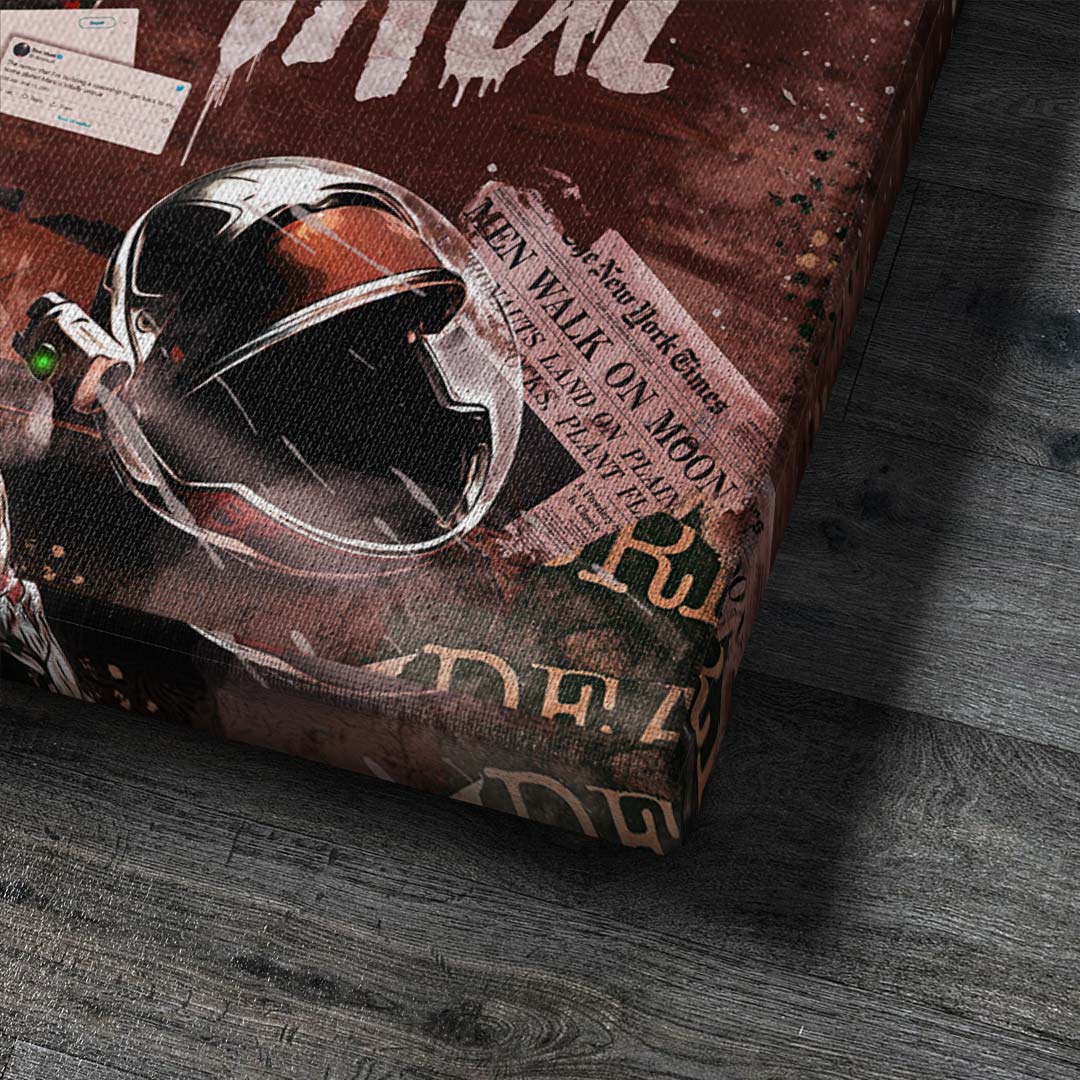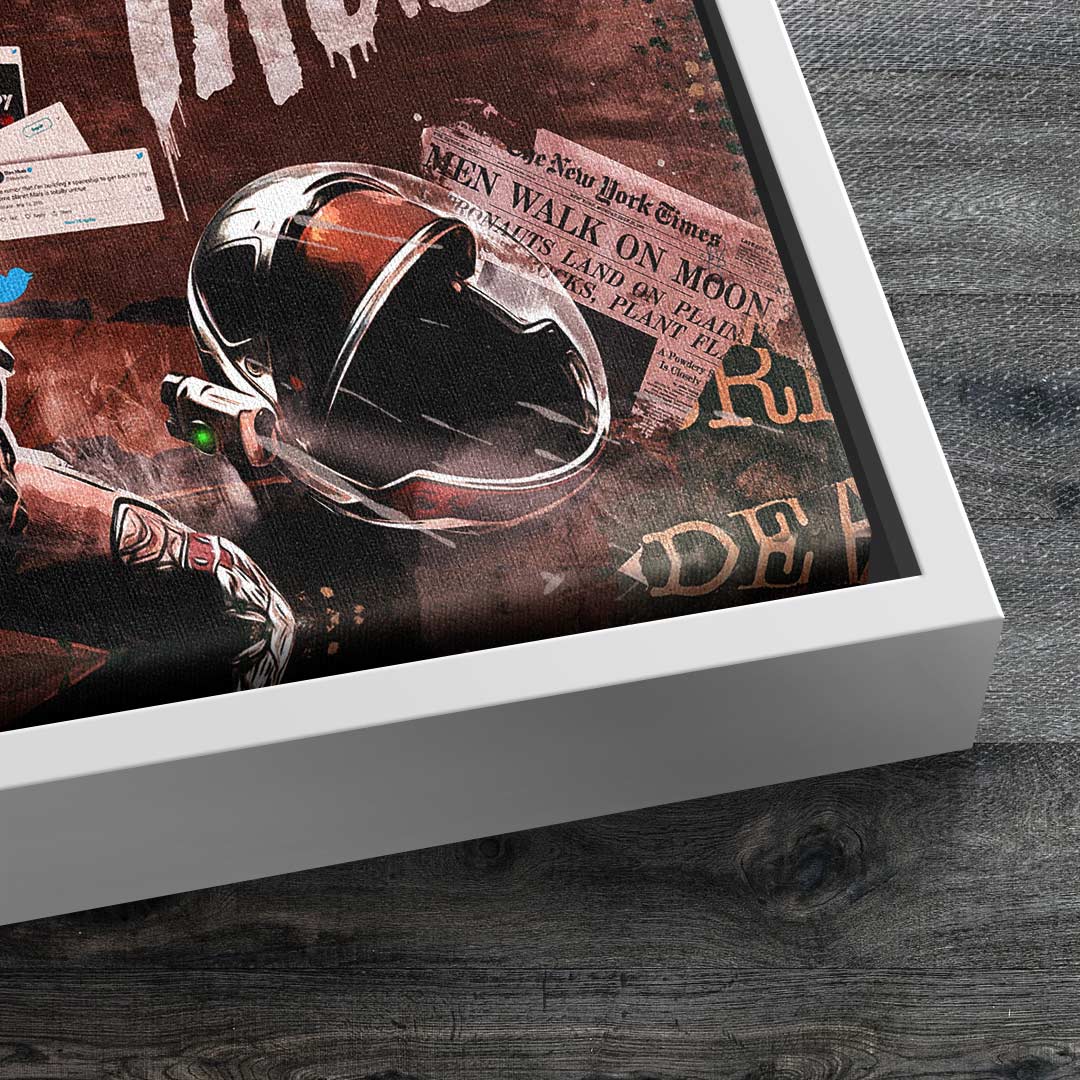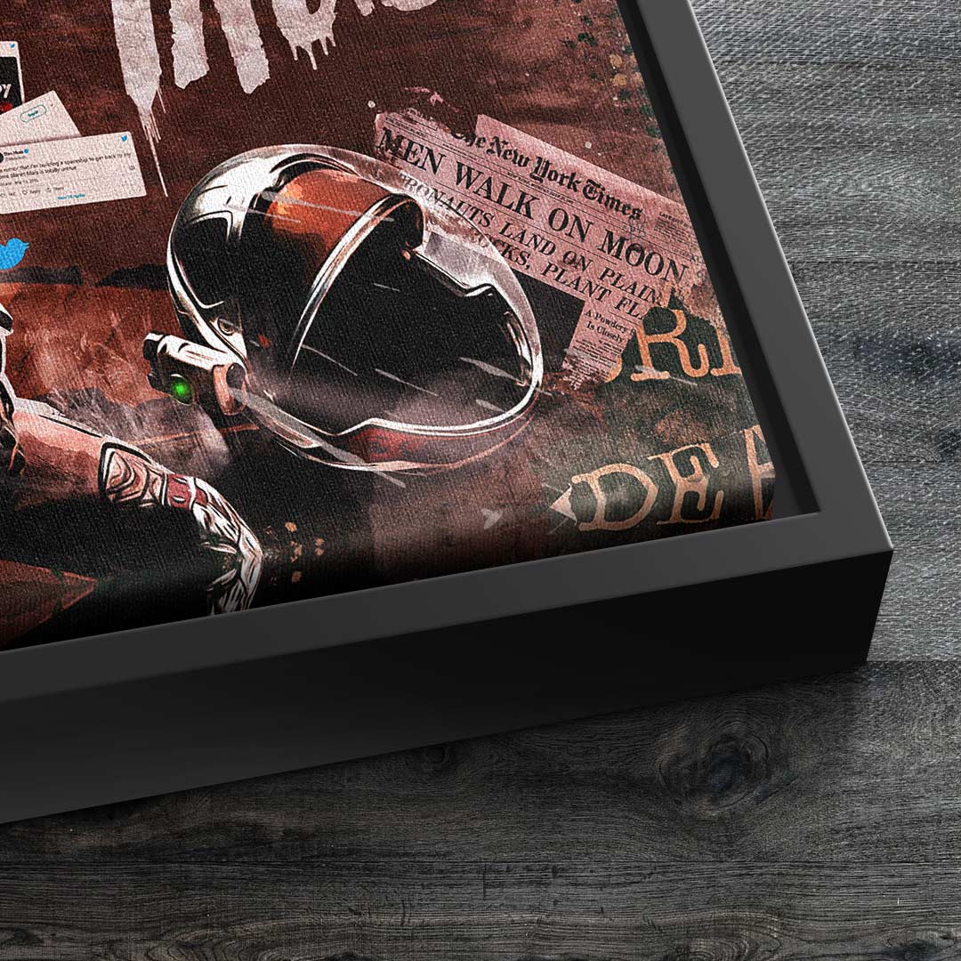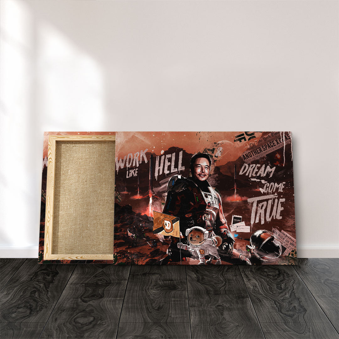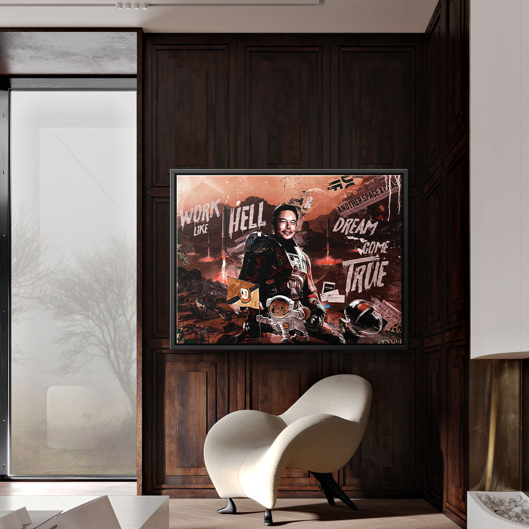DOTCOMCANVAS® wall mural with provocative and creative Elon Musk motif "Work like Hell, Dream come True."