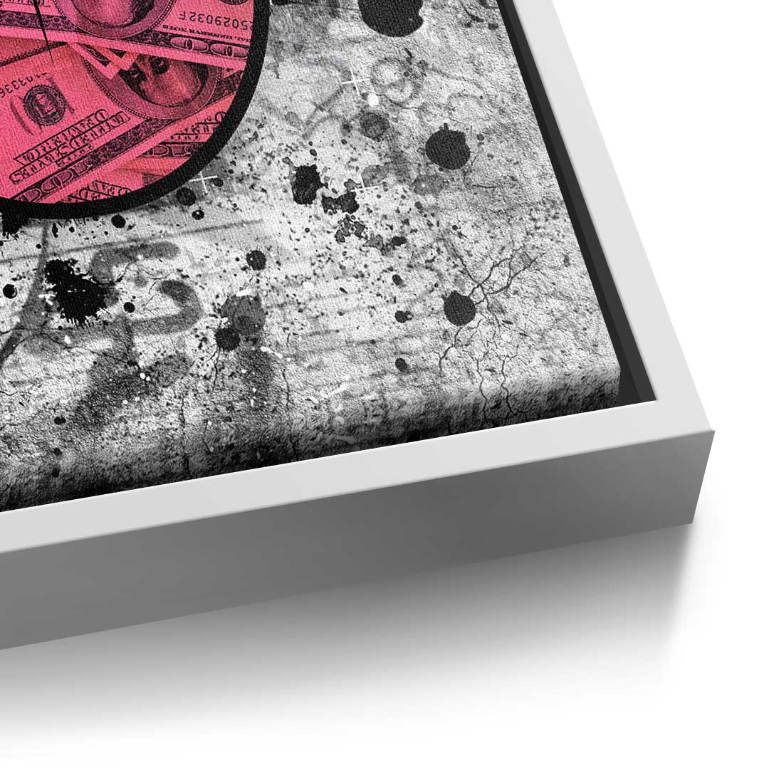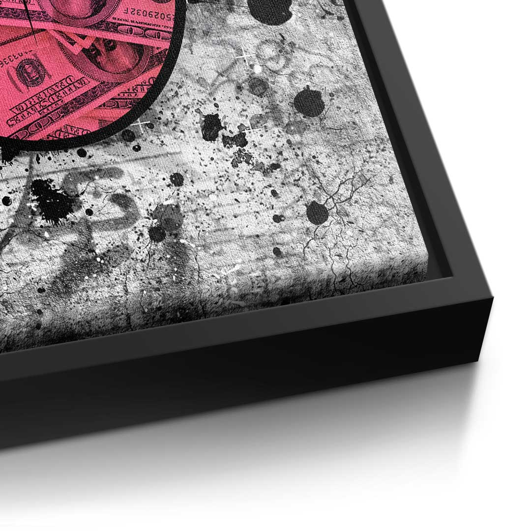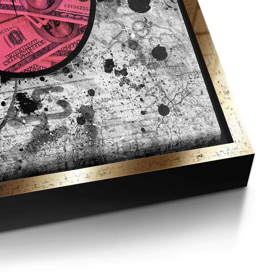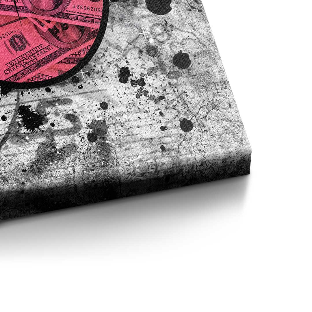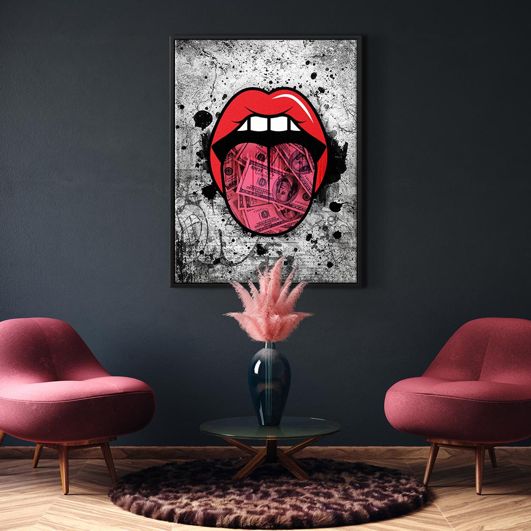 DOTCOMCANVAS® Premium Canvas Print in Pop Art Style: Mouth with tongue made of dollar bills in red and grey.