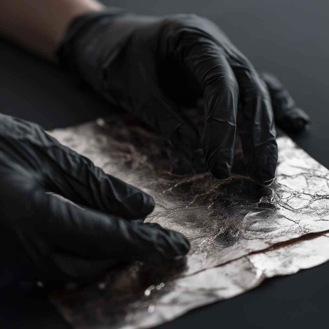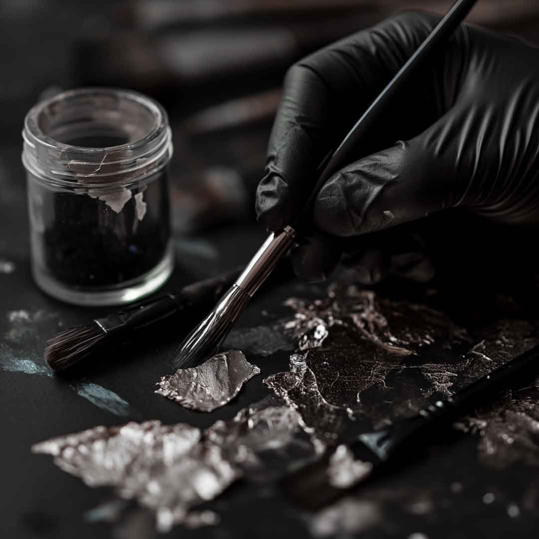 - Der gesamte Silberanteil wird in aufwendiger Handarbeit mit Blattsilber auf das Acrylglas gepinselt
